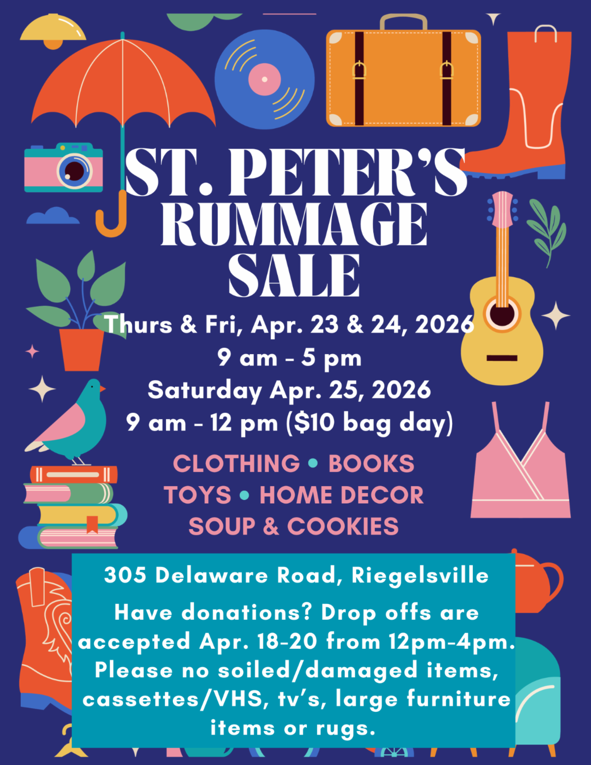 St. Peter's Rummage Sale Thursday & Friday, April 23rd & 24th, 9:00 a.m. - 5:00 p.m. Saturday, April 25th, 9:00 a.m. - 12:00 p.m. ($10 bag day) Clothing - Books… |